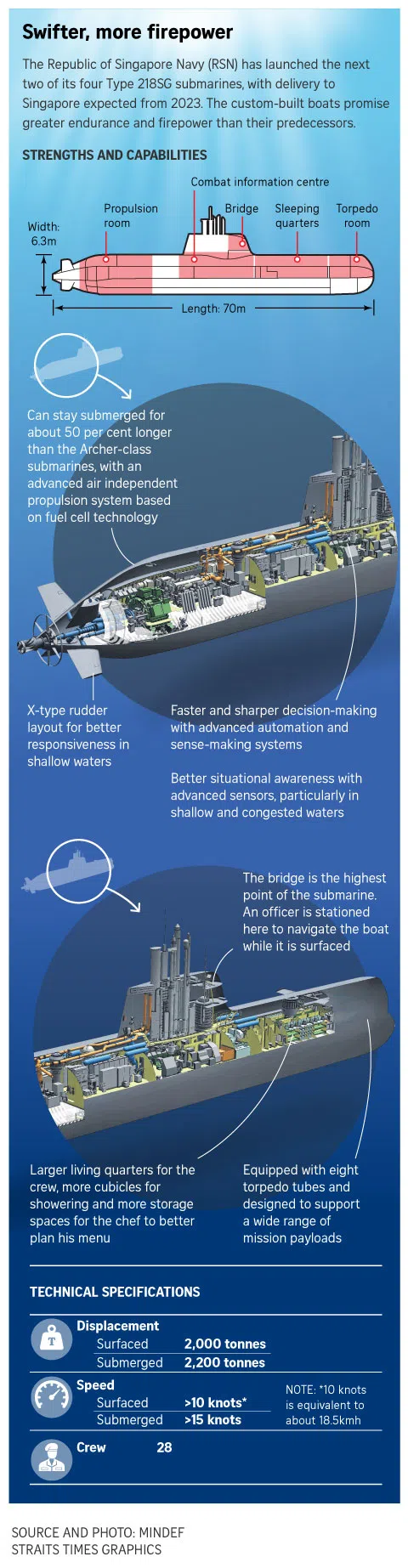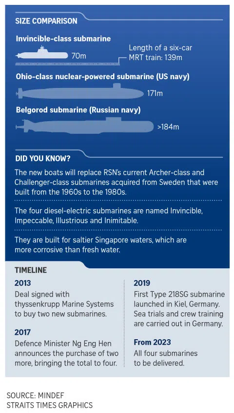 The custom-designed submarines will bring modern and advanced capabilities to RSN, he said at a ceremony in Germany to launch the Impeccable and Illustrious, the second and third of four Invincible-class boats.