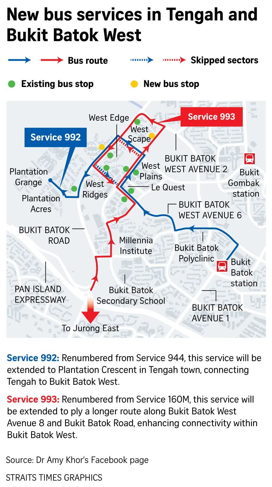 Existing bus services will be replaced by the two new ones, which will ply extended routes to serve more areas – service 992 will replace feeder service 944, while service 993 will replace service 160M.