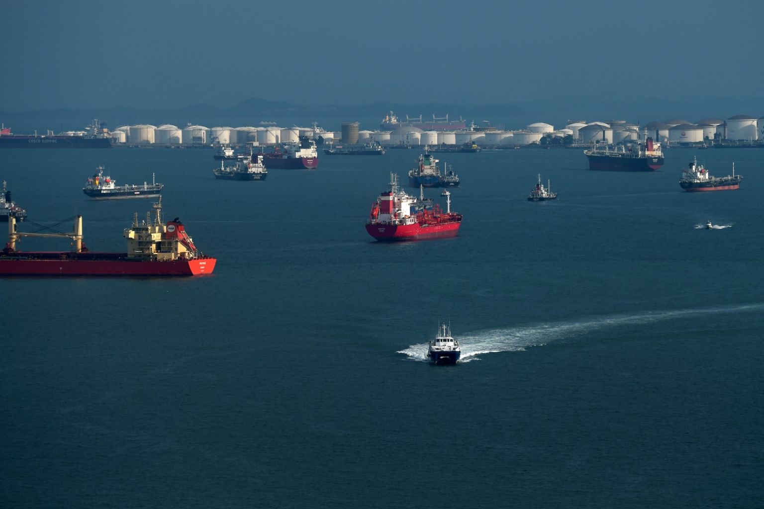 A photo taken on July 26, 2019, showing container ships moored off the Singapore Strait.