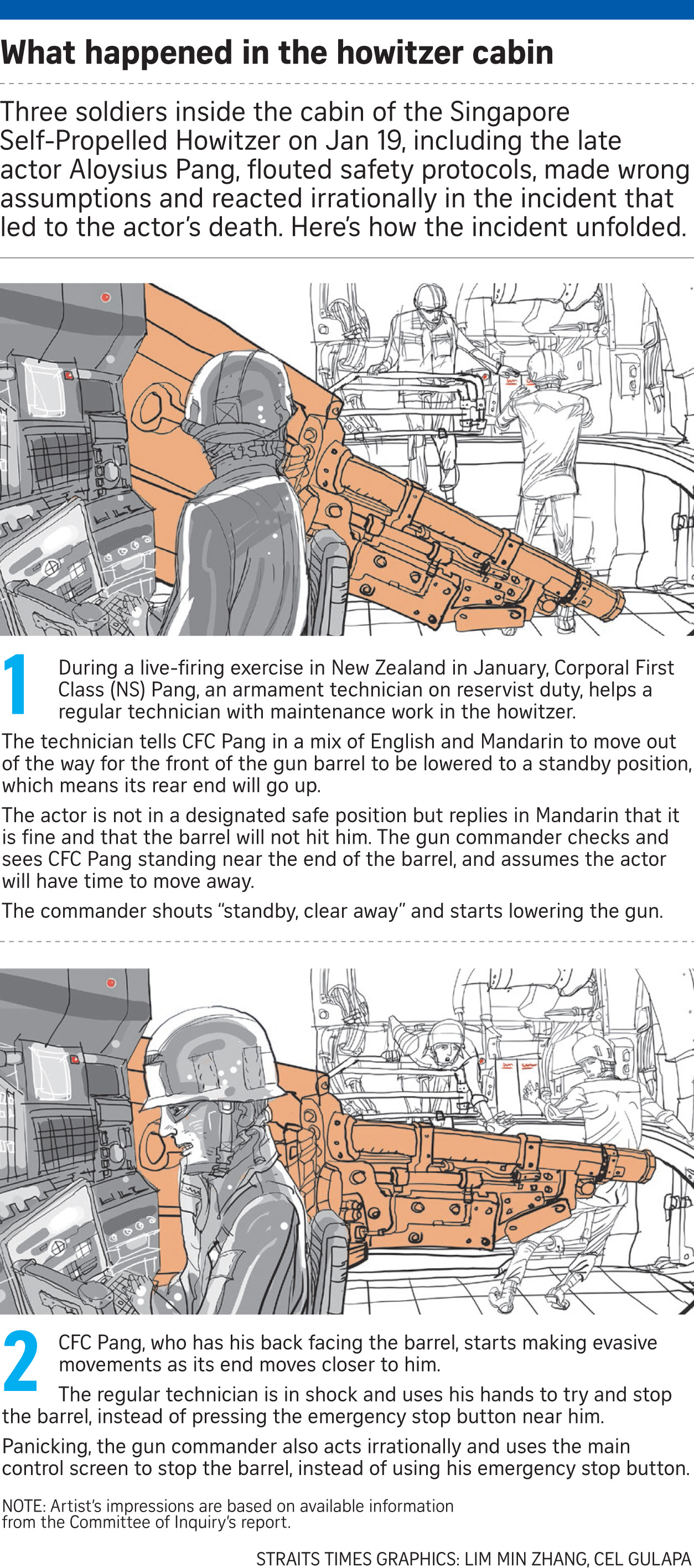In January, Corporal First Class (NS) Pang, 28, was seriously injured during a live-firing exercise in New Zealand, after getting trapped between the back of the gun barrel and the interior of the Singapore Self-Propelled Howitzer cabin.