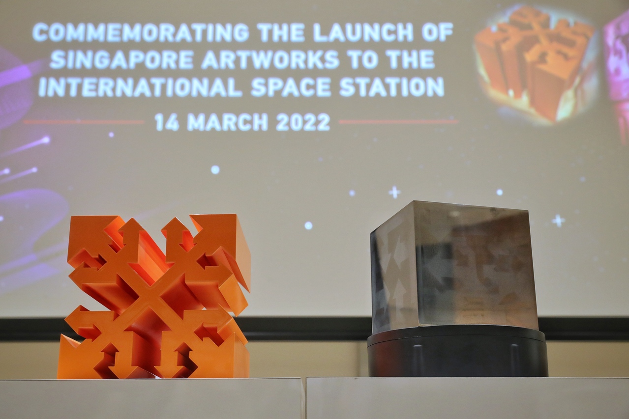 SINGAPORE - Two locally designed artworks are now orbiting Earth aboard the International Space Station (ISS), as part of a 64-piece Moon Gallery collection of miniature works by international artists.