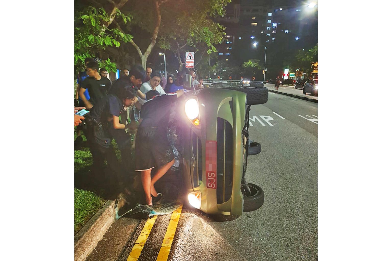 An eyewitness, who wanted to be known only as Madam Lin, told Chinese evening paper Shin Min Daily News that several passers-by helped to move the overturned car so that it was resting on its side instead.