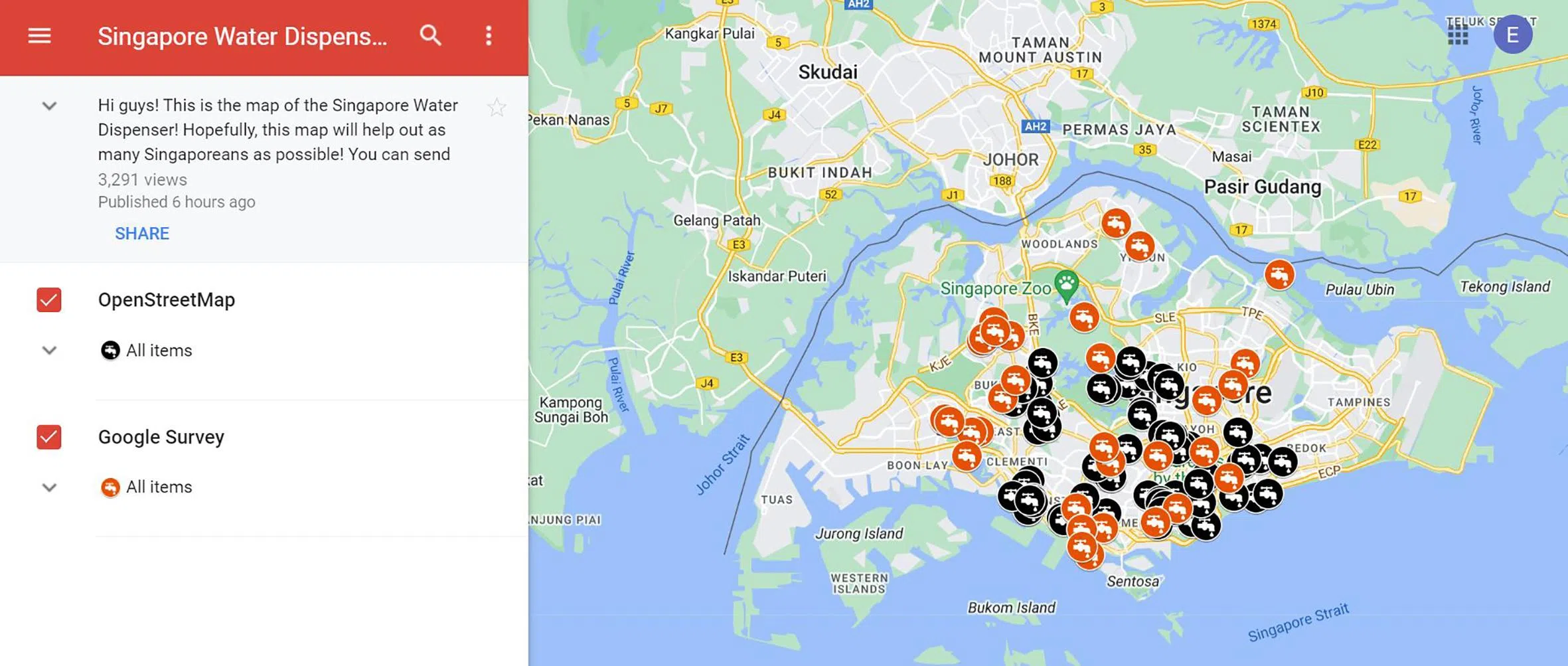 During his two-week term break earlier this month, he created a Google form and rallied the online community to contribute information for his project. He asked for details such as postal code, longitude, latitude, a photo of the water dispenser, street name and building, the level it is located on, an iconic landmark the dispenser is near, temperature of the water and even the company operating it.