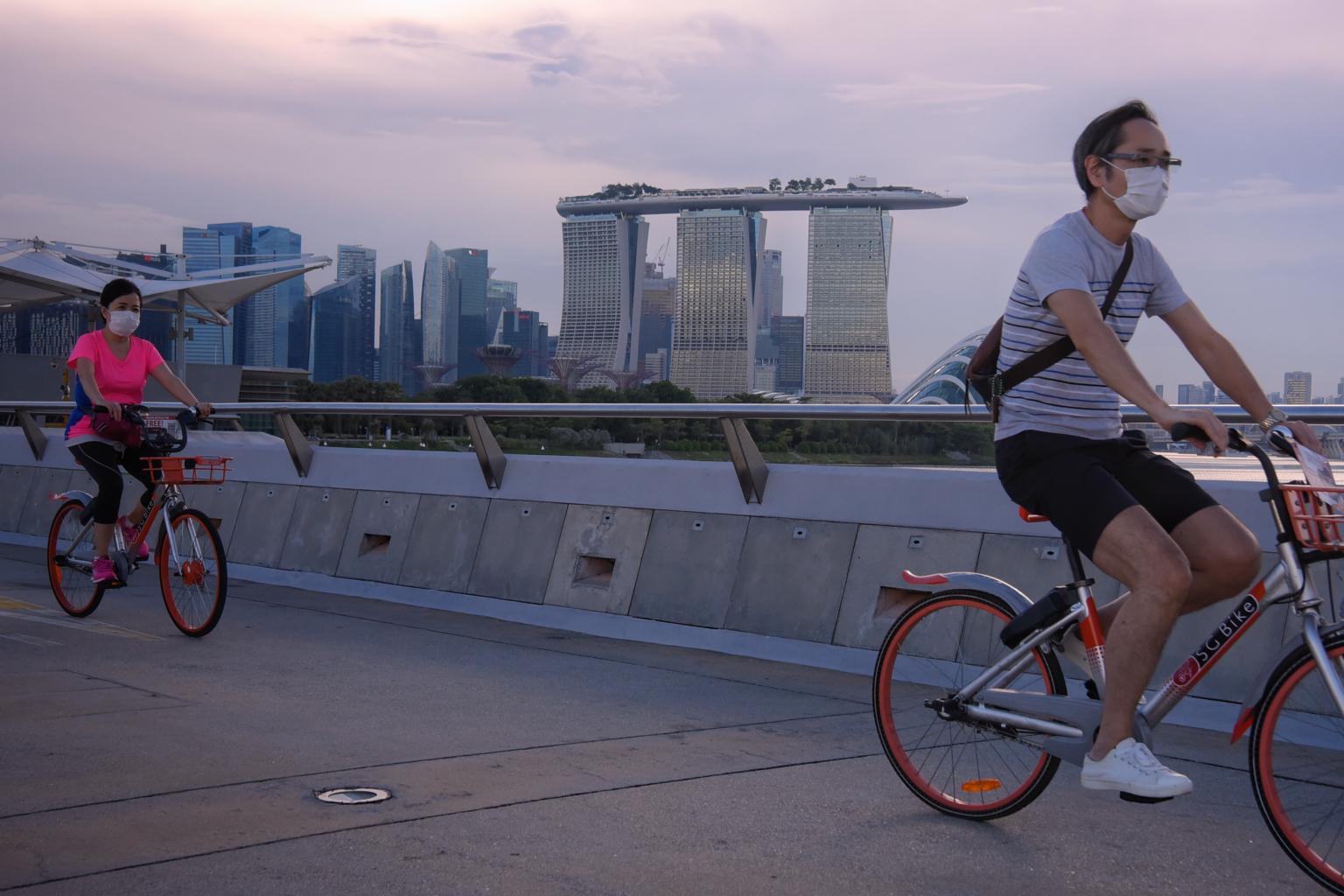 People wearing masks cycle at Gardens By The Bay East on May 30, 2020.