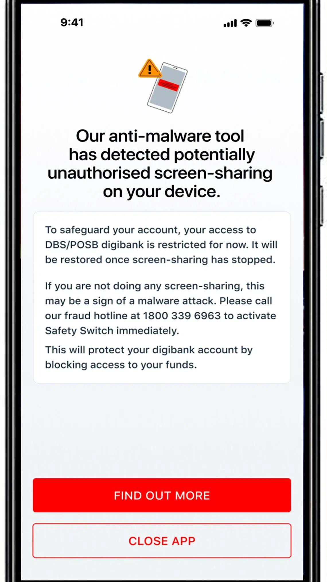 If potentially unauthorised screen sharing is detected, customers will be prompted to stop sharing their screens. If they are not sharing their screens, they will be asked to call DBS’ fraud hotline immediately, as this is indicative of a malware attack.
