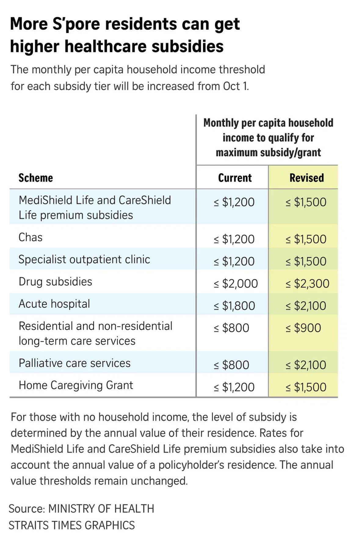 The revisions take effect from Oct 1, and up to 1.1 million Singapore residents are expected to benefit from the higher subsidies, said MOH.