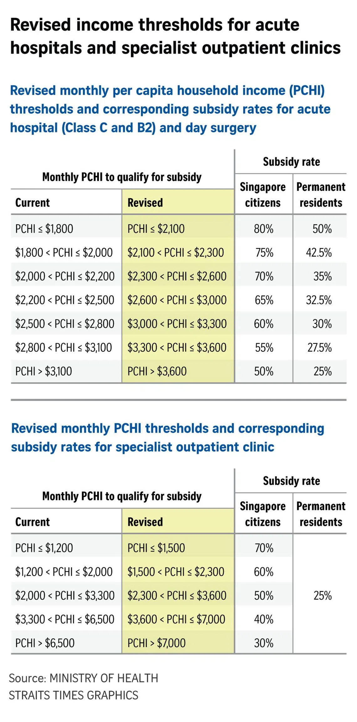 For instance, the 80 per cent subsidy for C and B2 wards at public hospitals would be given to those with PCHI of up to $2,100, from $1,800. For a family of four, this works out to a household income totalling $8,400, up from $7,200.
