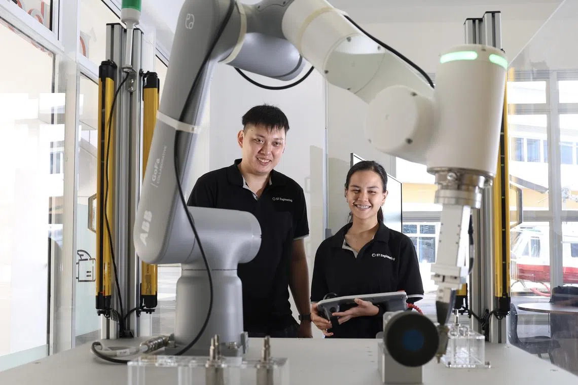 ITE work-study diploma students Anderson Lim and Siti Sauhana using the polishing robot arm at the new Onboarding@Skill facility at ITE College Central.
