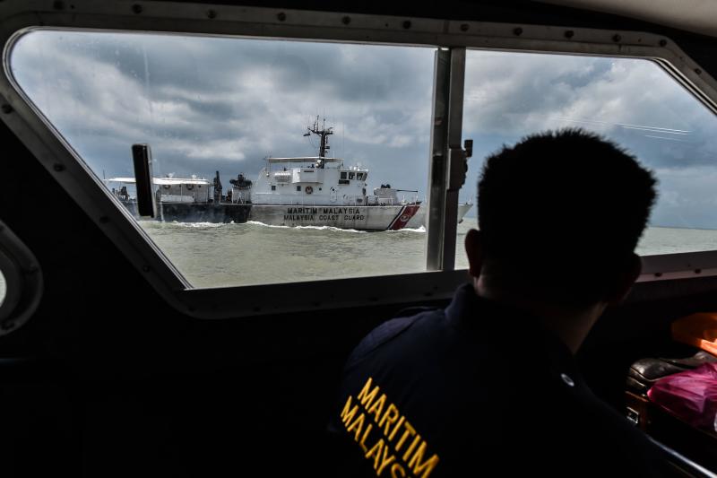 A member of the Malaysian Maritime Enforcement Agency taking part in the rescue operation for the missing sailors from the USS John S. McCain off the Johor coast.