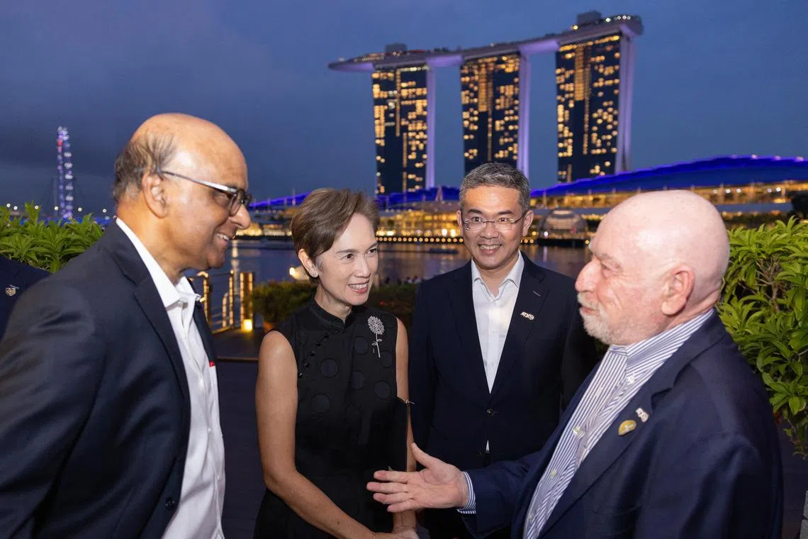 (From left) President Tharman Shanmugaratnam, Minister for Digital Development and Information Josephine Teo, Infocomm Media Development Authority chief executive Lew Chuen Hong and Salesforce chief futures officer Peter Schwartz meeting before the opening gala for the fifth Asia Tech x Singapore annual tech conference at The Fullerton Bay Hotel on May 27.