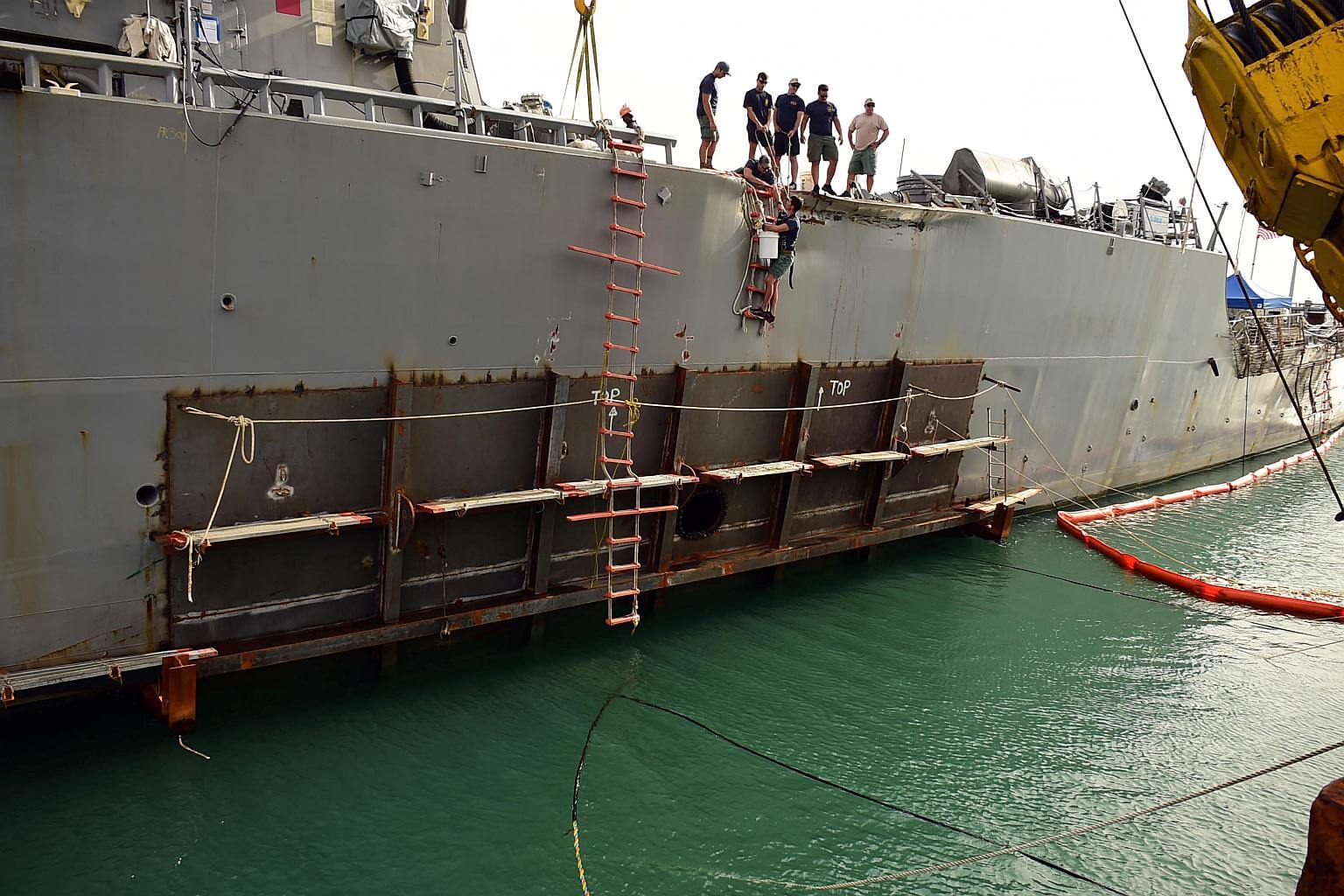 USS John S. McCain is pictured at Changi Naval Base in Singapore after a temporary patch was welded to the area damaged by the collision.