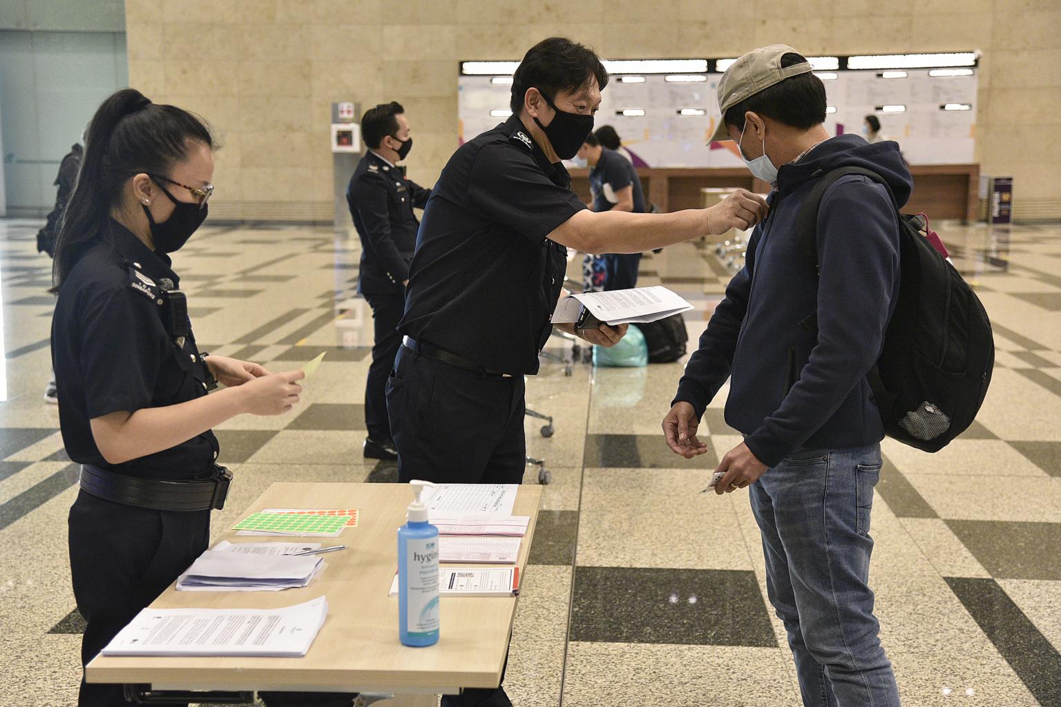 Singapore citizens and PRs being served stay-home notices by ICA officers at Changi Airport Terminal 3 on May 10, 2020.