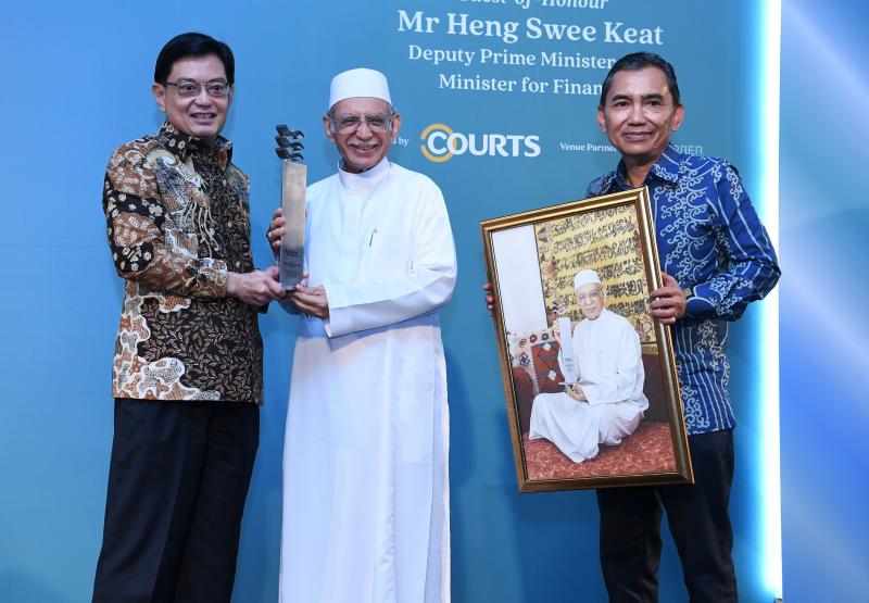 Mr Heng presented the Berita Harian Achiever of the Year award to Imam Syed Hassan Mohamed Al-Attas, the head of Ba'alwie Mosque in Lewis Road, in recognition of his contributions to interfaith work.