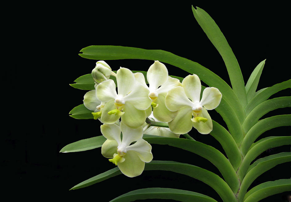 The Aranda Lee Kuan Yew hybrid, with its bright greenish yellow blooms, shares lineages and physical appearance with the Vanda Kwa Geok Choo.