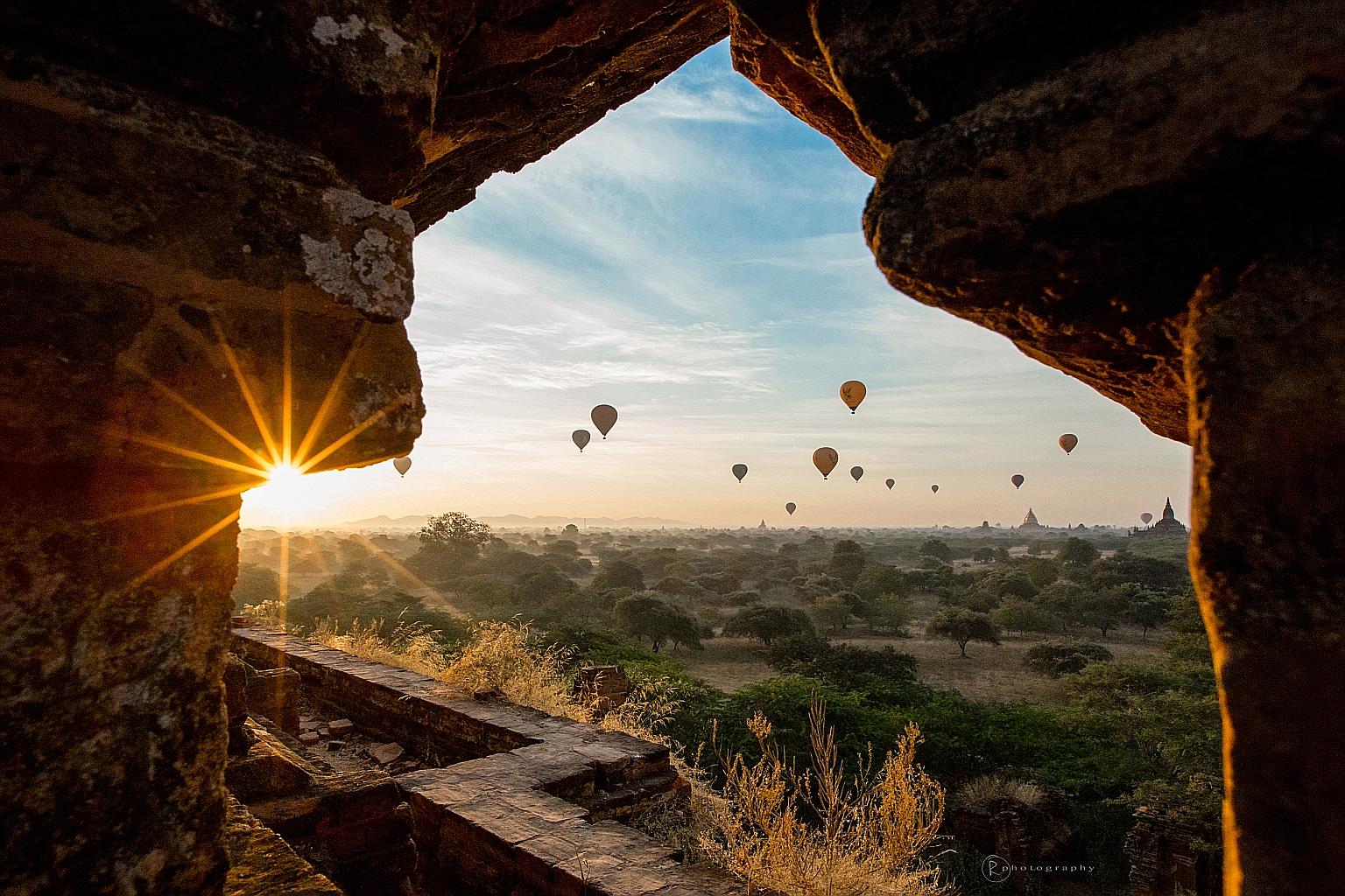 Hot-air balloon rides at sunrise in Bagan, Myanmar. Ballooning is one of the best ways to get breathtaking views of the city, which has 2, 200 temples and pagodas. Ballooning runs from October to April.