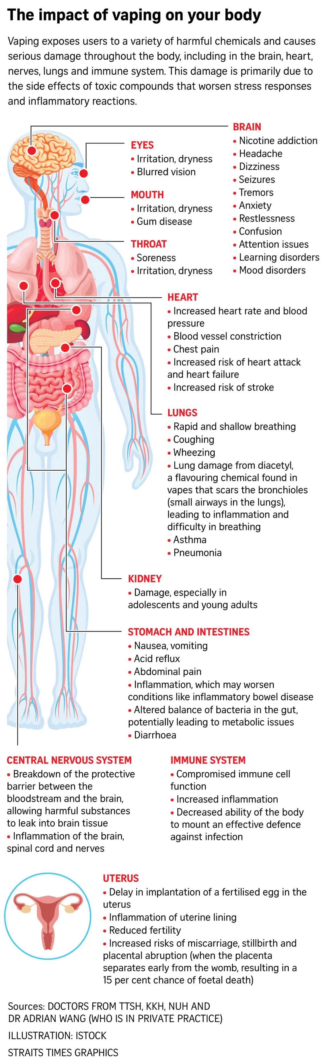 Dr Chee said that while some ill effects of vaping may improve with early cessation, changes to brain function, especially with repeated exposure, can persist into adulthood, raising the possibility of long-term neurodevelopmental harm.
