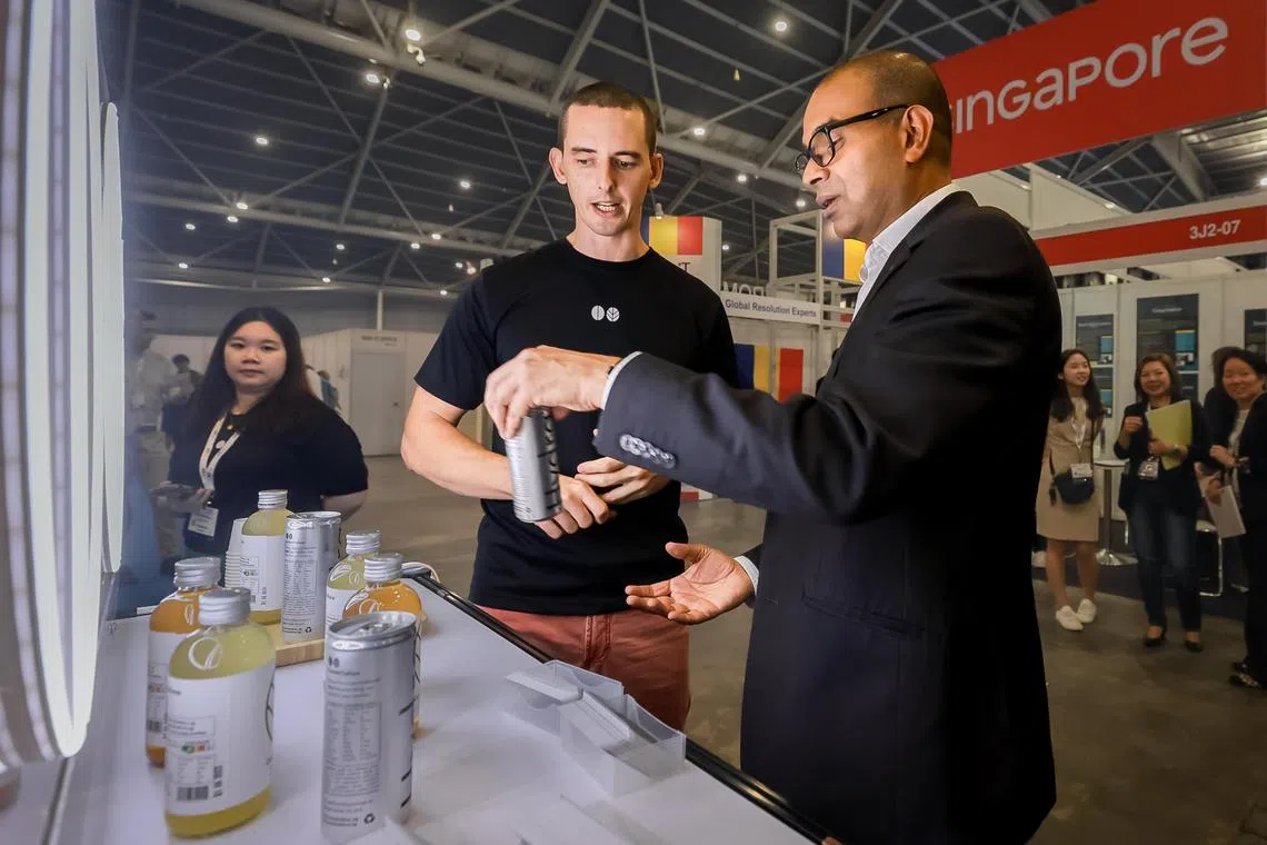 Senior Minister of State for Communications and Information Janil Puthucheary with Curated Culture co-founders Shermaine Heng (left) and Christian Eviston-Putsch (centre) at its probiotic drinks booth at the Asia Tech x Singapore exhibition.