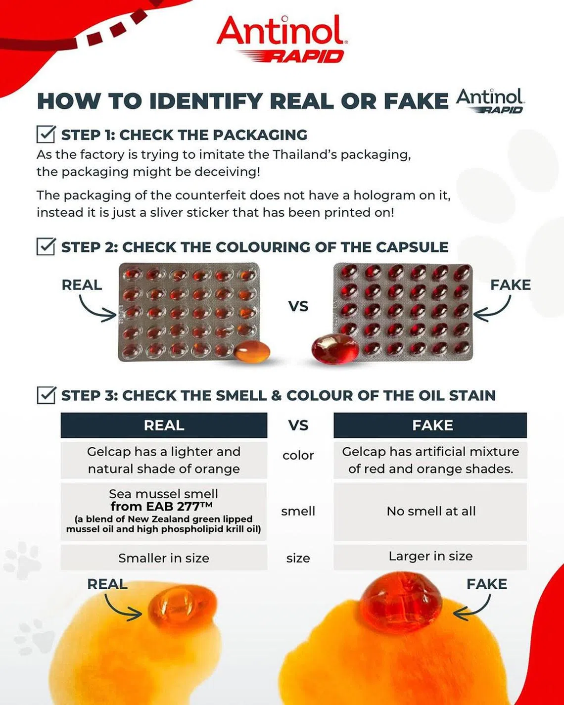 “For instance, counterfeit Antinol does not contain the active ingredients necessary for therapeutic effects, posing significant health risks to pets,” she said.