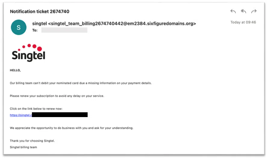 In the case of the scam e-mails purportedly from Singtel, victims were told that their accounts faced billing issues due to missing information. They were instructed to click on the embedded link to renew their subscriptions.
