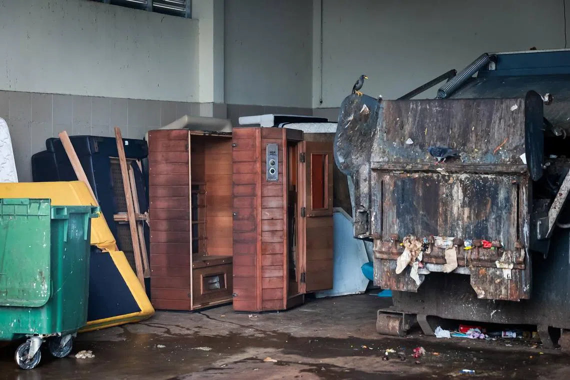 A dismantled sauna cabin in a bin centre at Block 419 Serangoon Central.