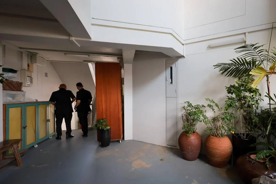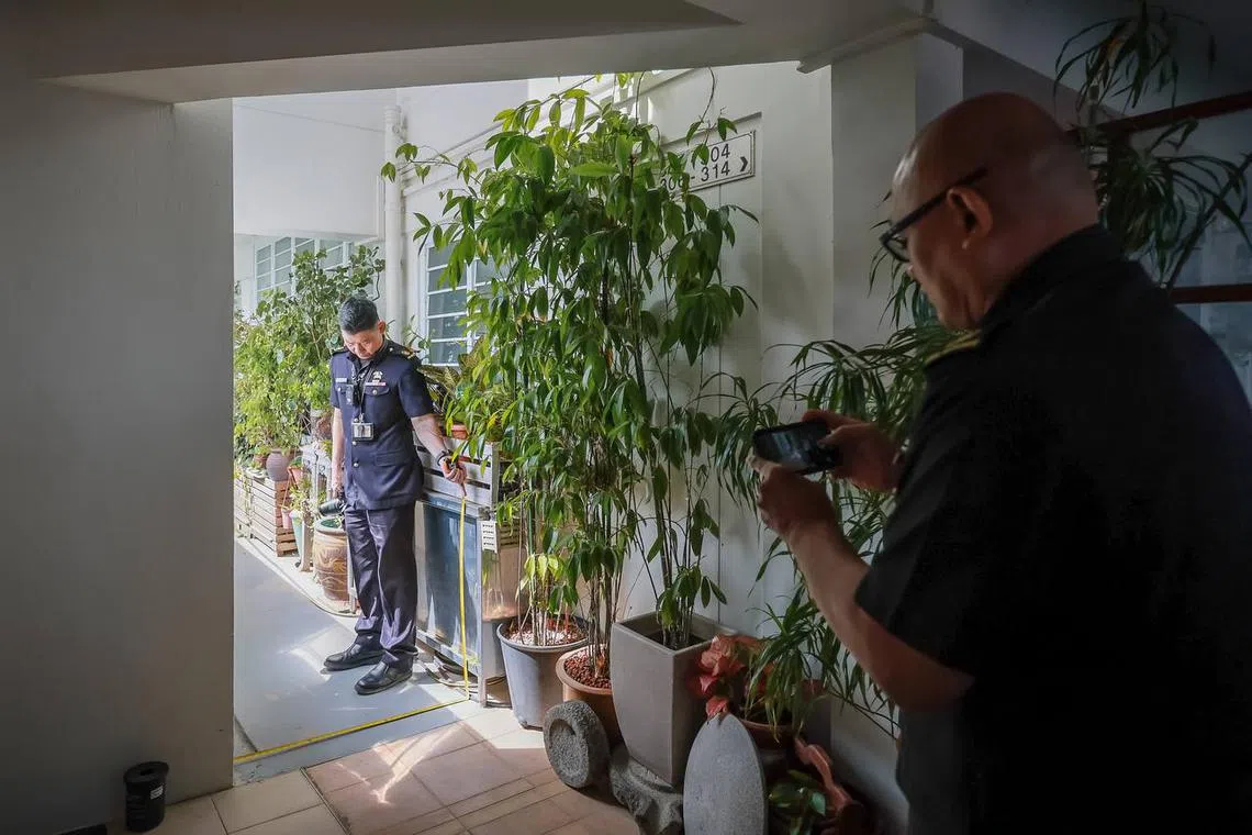 Two men in Singapore Civil Defence Force (SCDF) uniform were seen outside the flat using measuring tape to gauge the distance between the wall and a cabinet placed in the corridor beside the unit.