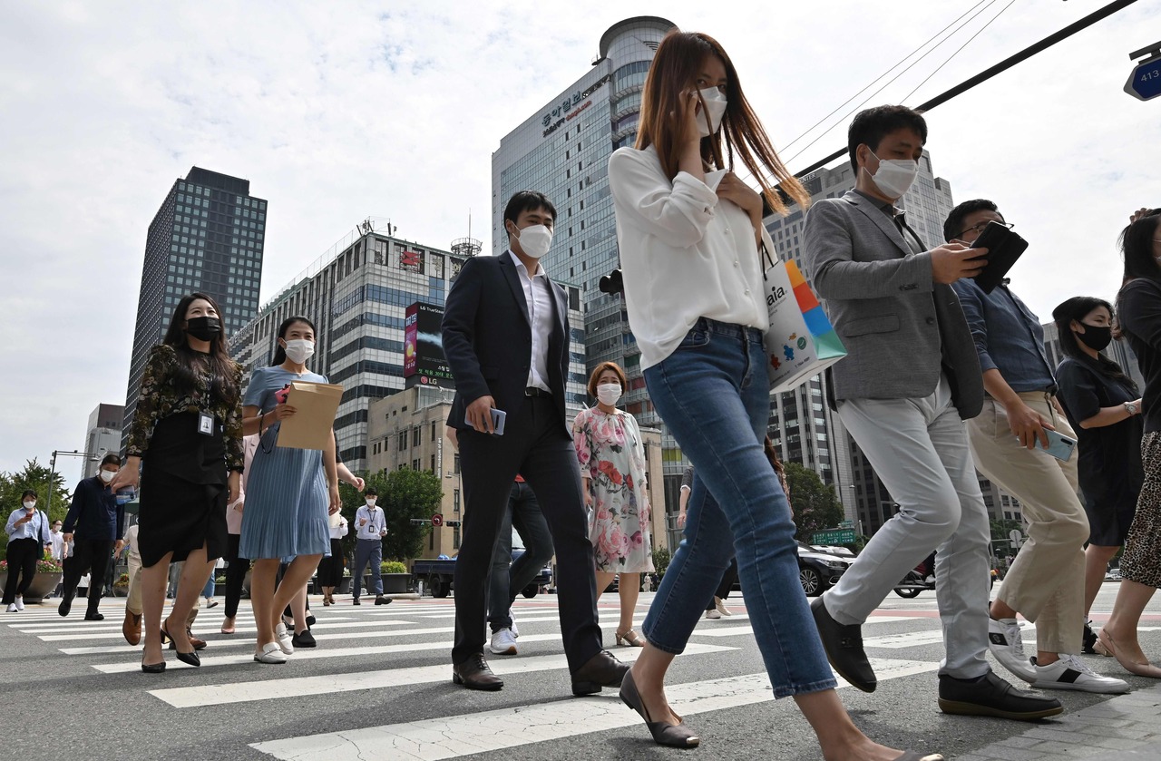 People wearing face masks cross a road in Seoul, on Sept 11, 2020.South Korea’s early success in containing the pandemic was thwarted by a mid-August rally that led to another massive outbreak in the country.
