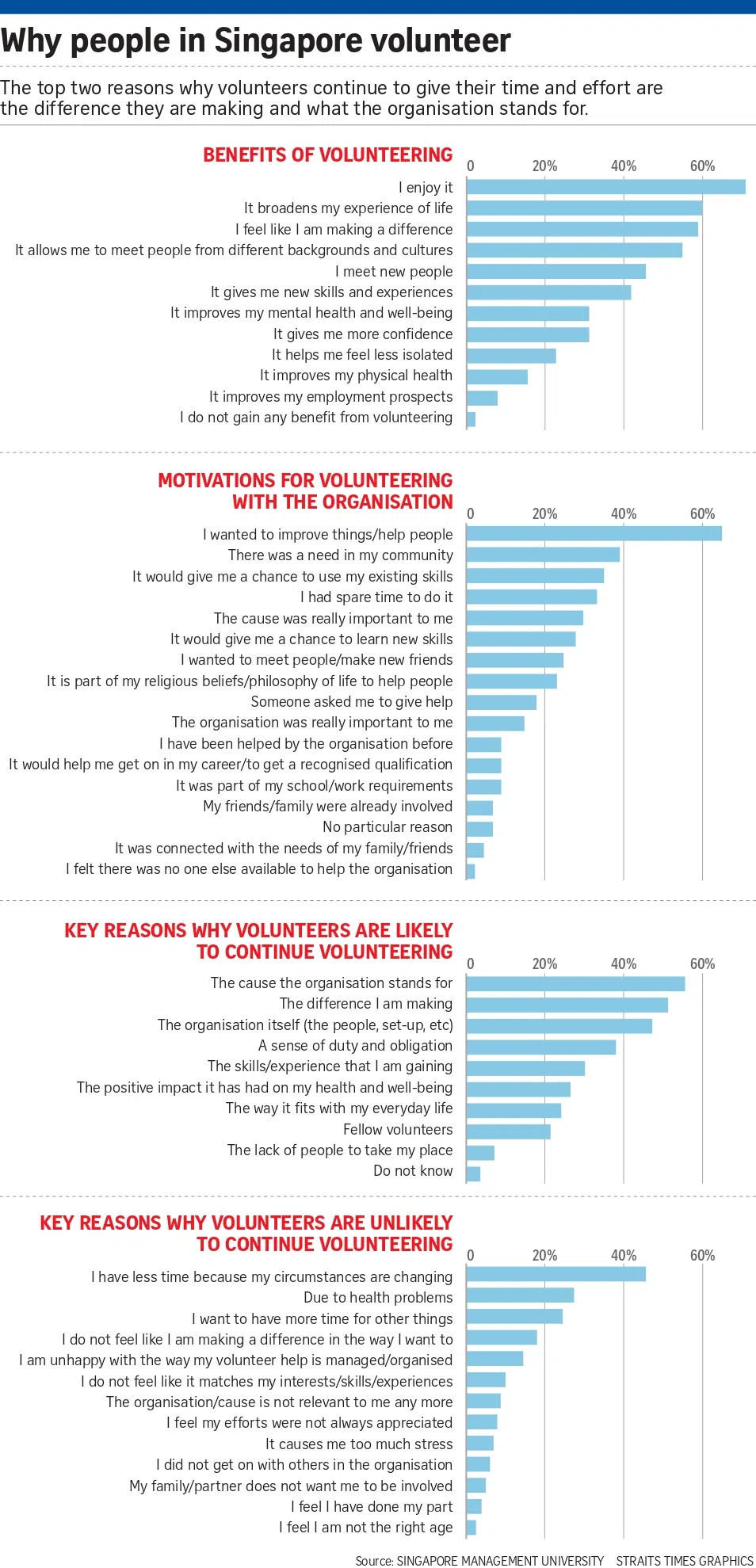 SINGAPORE – The first study on the volunteer experience here has found that the top two reasons why volunteers continue to give their time and effort are the difference they are making and because they believe in what the organisation stands for.
