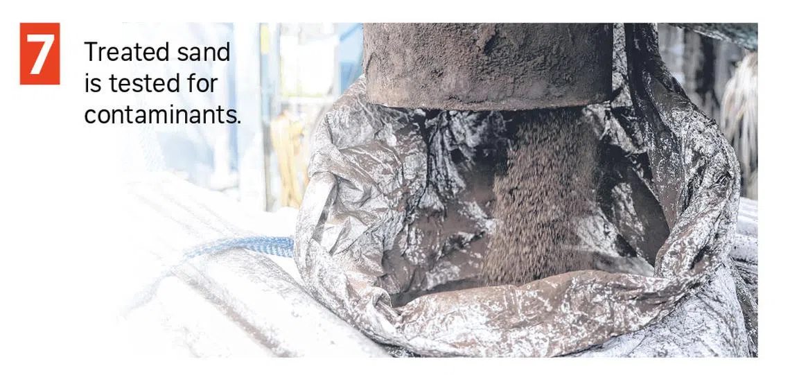 Oil-soaked sand is sent to licensed toxic industrial waste collectors for treatment. Heat is used to vaporise oil and water from contaminated sand. The recovered oil can be converted into a product for resale, while the sand can potentially be repurposed for industrial uses.