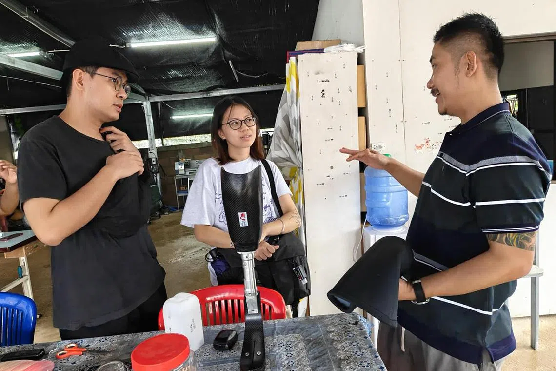(From left) Mr Lok Bing Hong and Miss Lynn Wen Wen (centre) at a prosthetic manufacturing workshop run by revolutionary Saw Cho Lay.