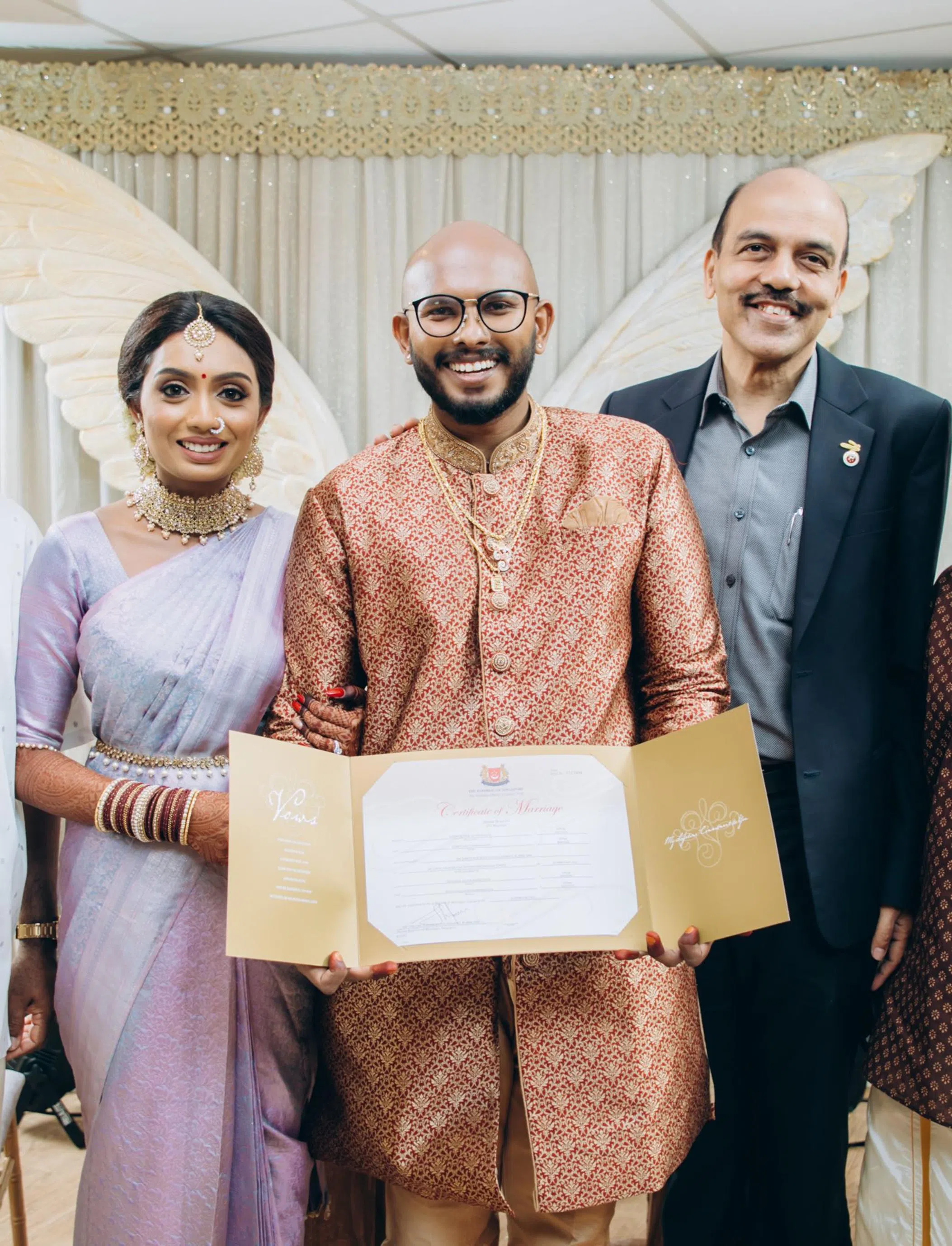 Ms Roshini Thangarajan and Mr Kishen Kumar Thanabal with their solemniser Thirunal Karasu Palaniappan.