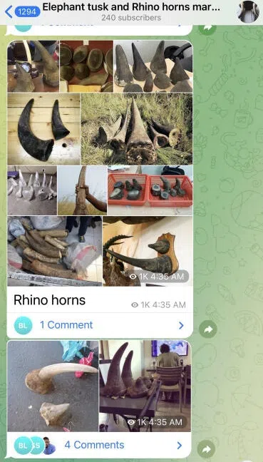 On Telegram, groups sell wildlife and their parts that are banned under Cites. These include elephant tusks and rhinoceros horns.