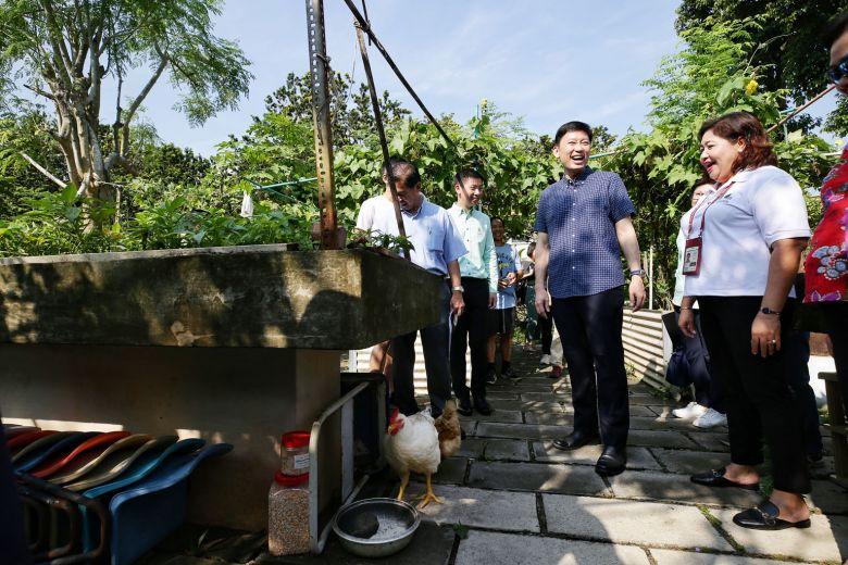 Senior Minister of State for Trade and Industry Chee Hong Tat (centre) at a community garden as part of a tour of Ang Mo Kio yesterday.