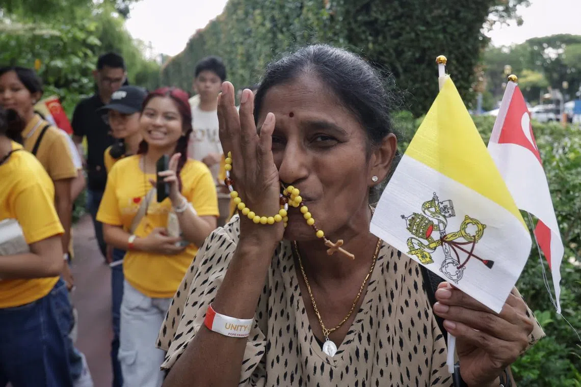 An hour before the Pope was scheduled to arrive from Timor-Leste’s capital of Dili, some 1,000 Roman Catholics had made their way to Jurassic Mile at Changi Airport to welcome him.