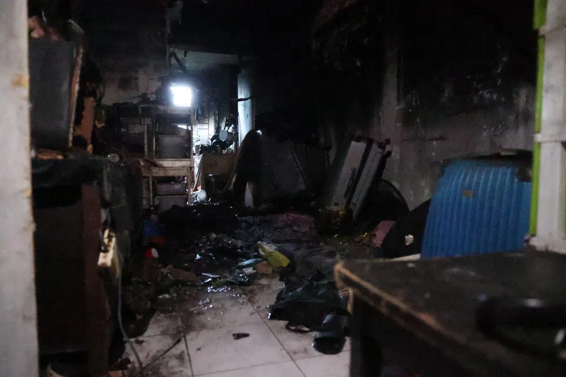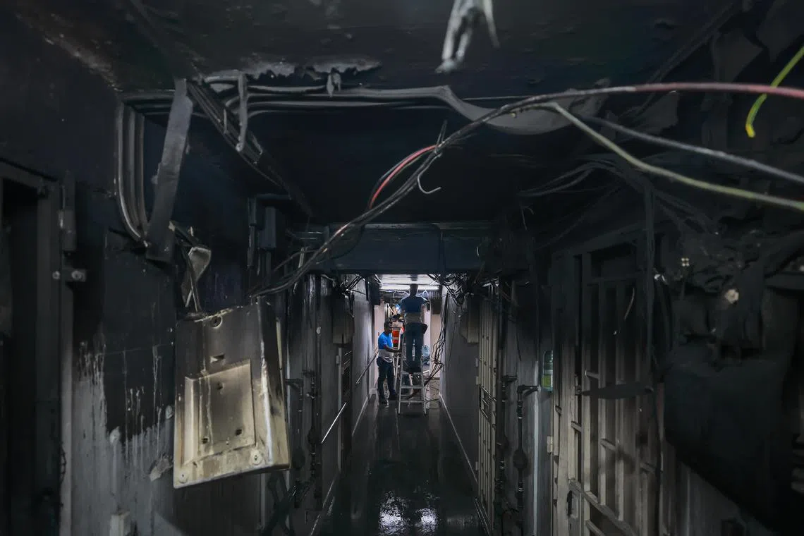 When The Straits Times visited the block on Friday morning, the corridor was charred and workers were fixing the wiring hanging outside.