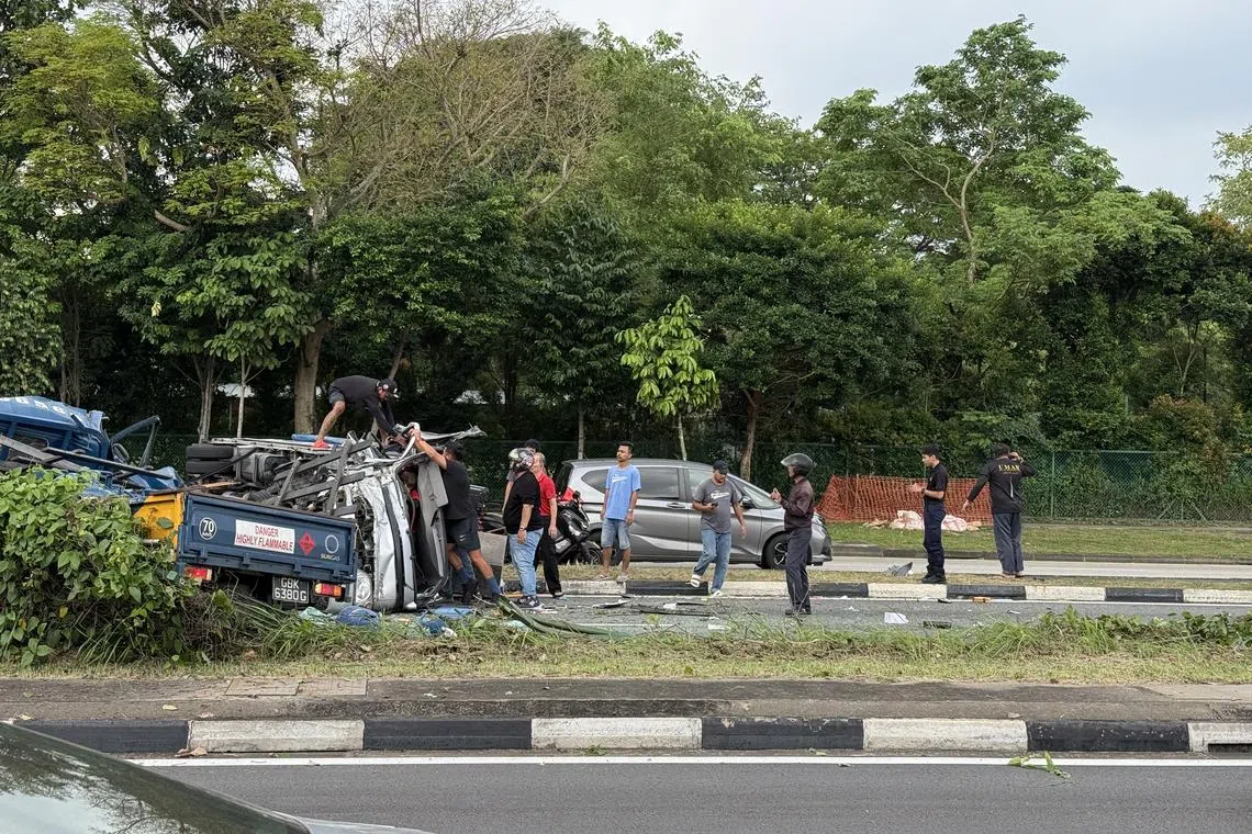 Realising that there was an accident there between two lorries, they then stopped their car at the side of the road near Raffles Girls’ School to help, after informing the Singapore Civil Defence Force (SCDF) at about 2pm.
