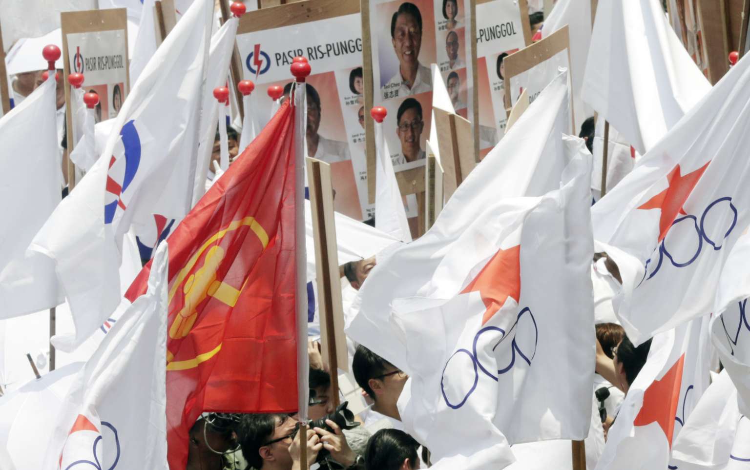 Supporters of People's Action Party (PAP), Workers' Party (WP) and Singapore Democratic Alliance (SDA) with their party flags as they gathered at Fengshan Primary School on Sept 1, 2015.