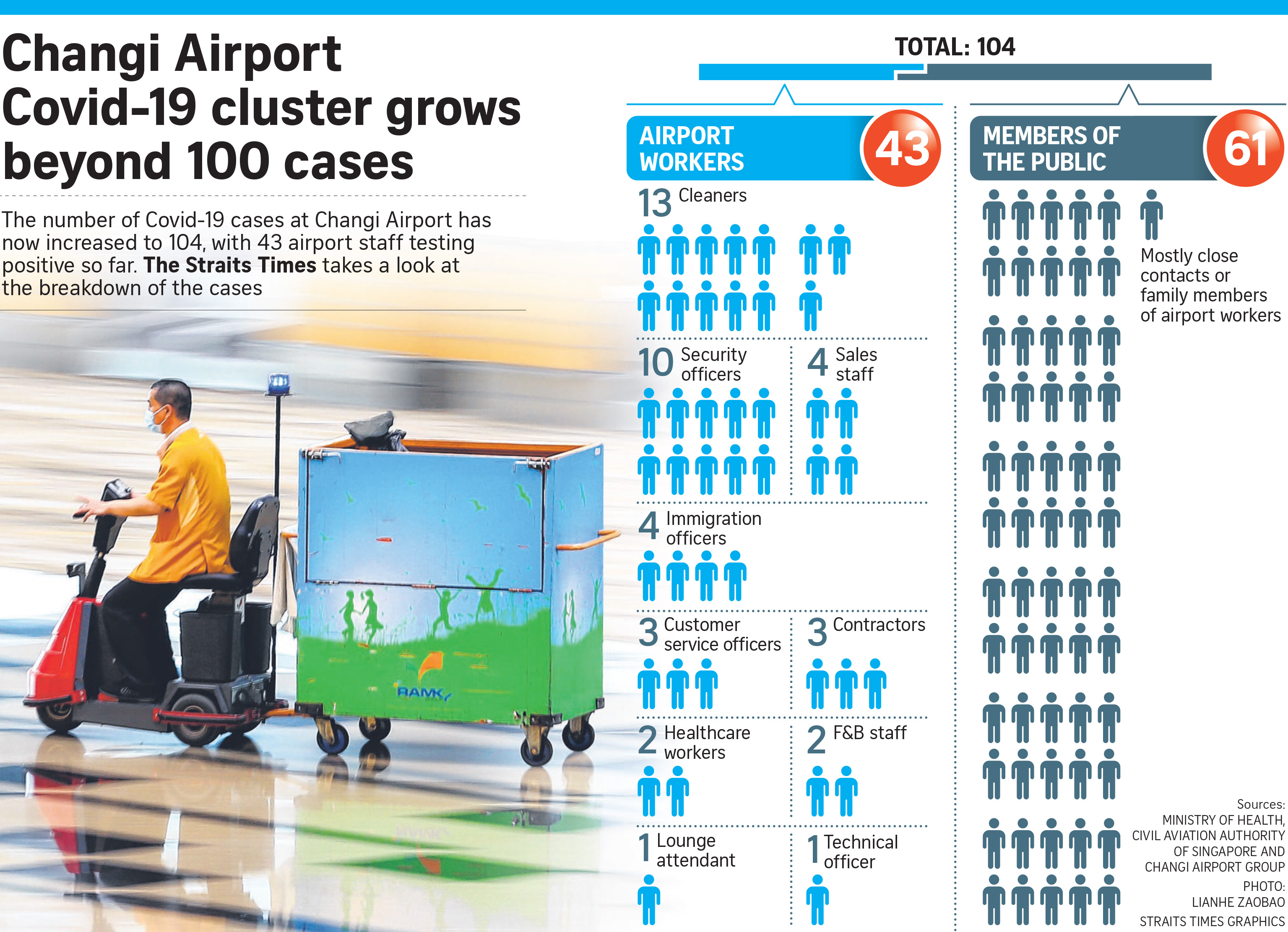 In less than a month, the Covid-19 cluster at Changi Airport has swelled to more than 100 people, including airport workers whose jobs did not require them to interact with passengers, family members of front-line staff and visitors.