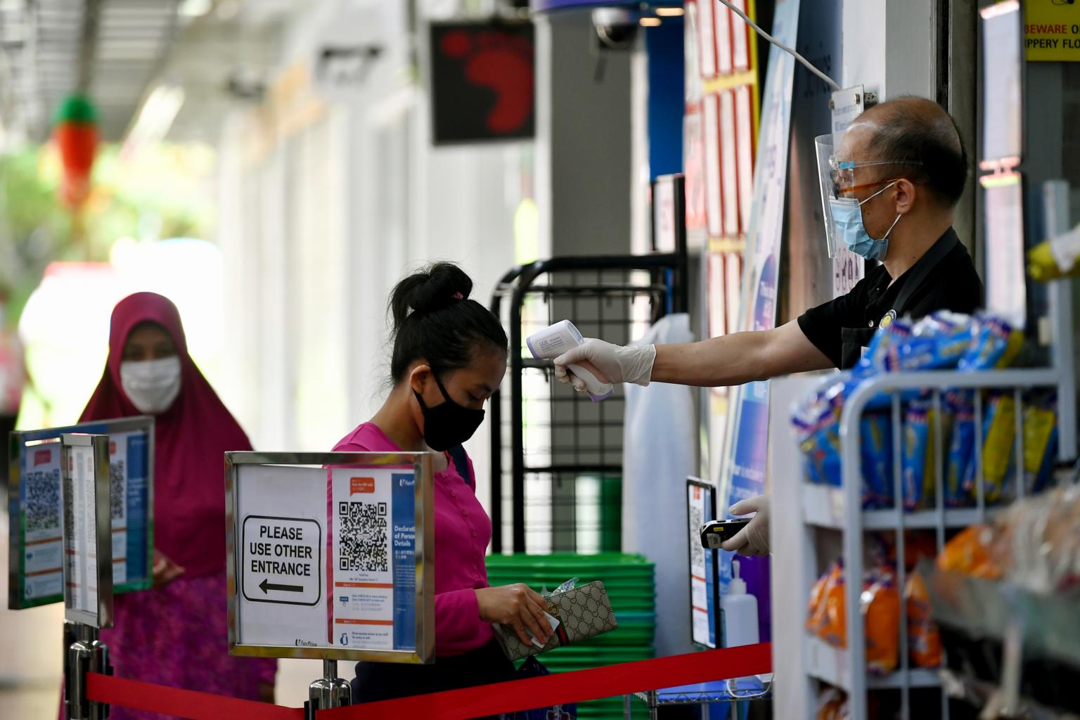 A staff of NTUC Fairprice takes a customer's temperature on May 25, 2020.
