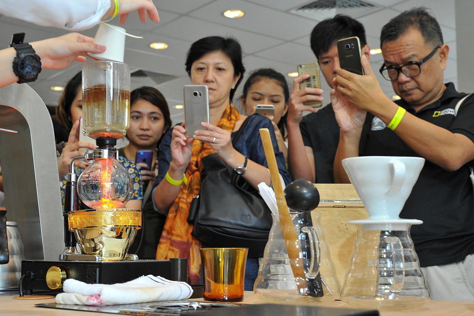 Visitors at the Papa Palheta booth at Singapore Coffee Festival looking at the method of brewing coffee using syphon on June 10.