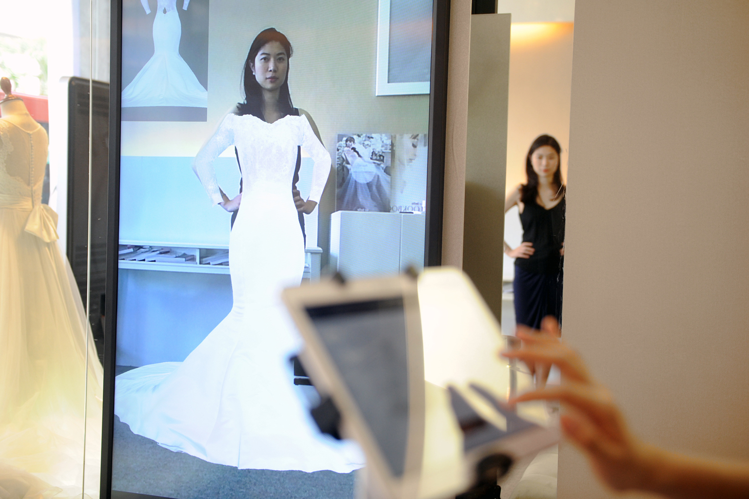 At La Belle Couture Weddings boutique, women can try on gowns without removing clothes, using FXMirror (photo), an augmented reality system involving 3D visualisation. Korean beauty brand Laneige has an app that captures a user's movement and expression so she can put on make-up without applying anything on her face.
