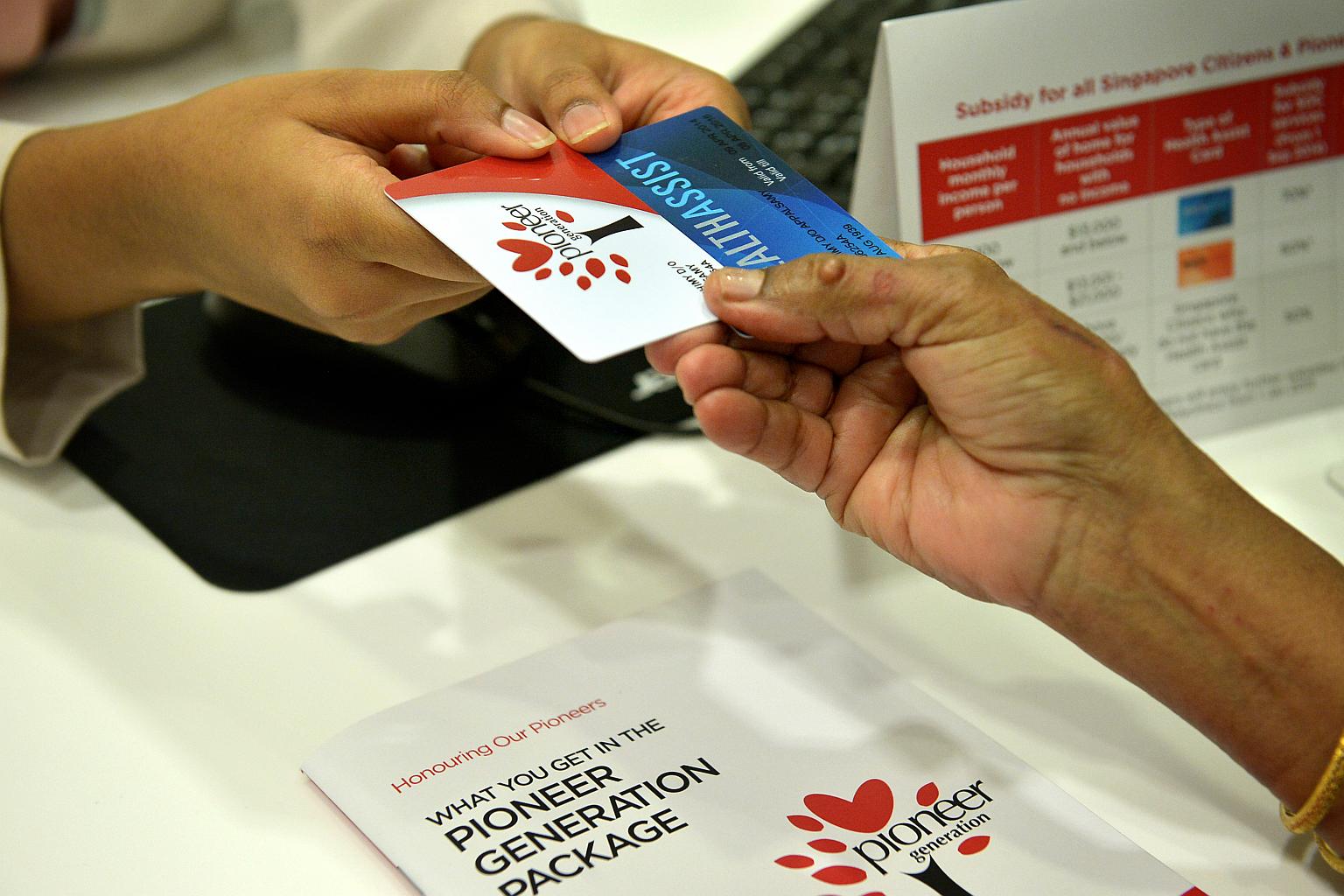 A hospital staff handing the Pioneer Generation card to a patient.