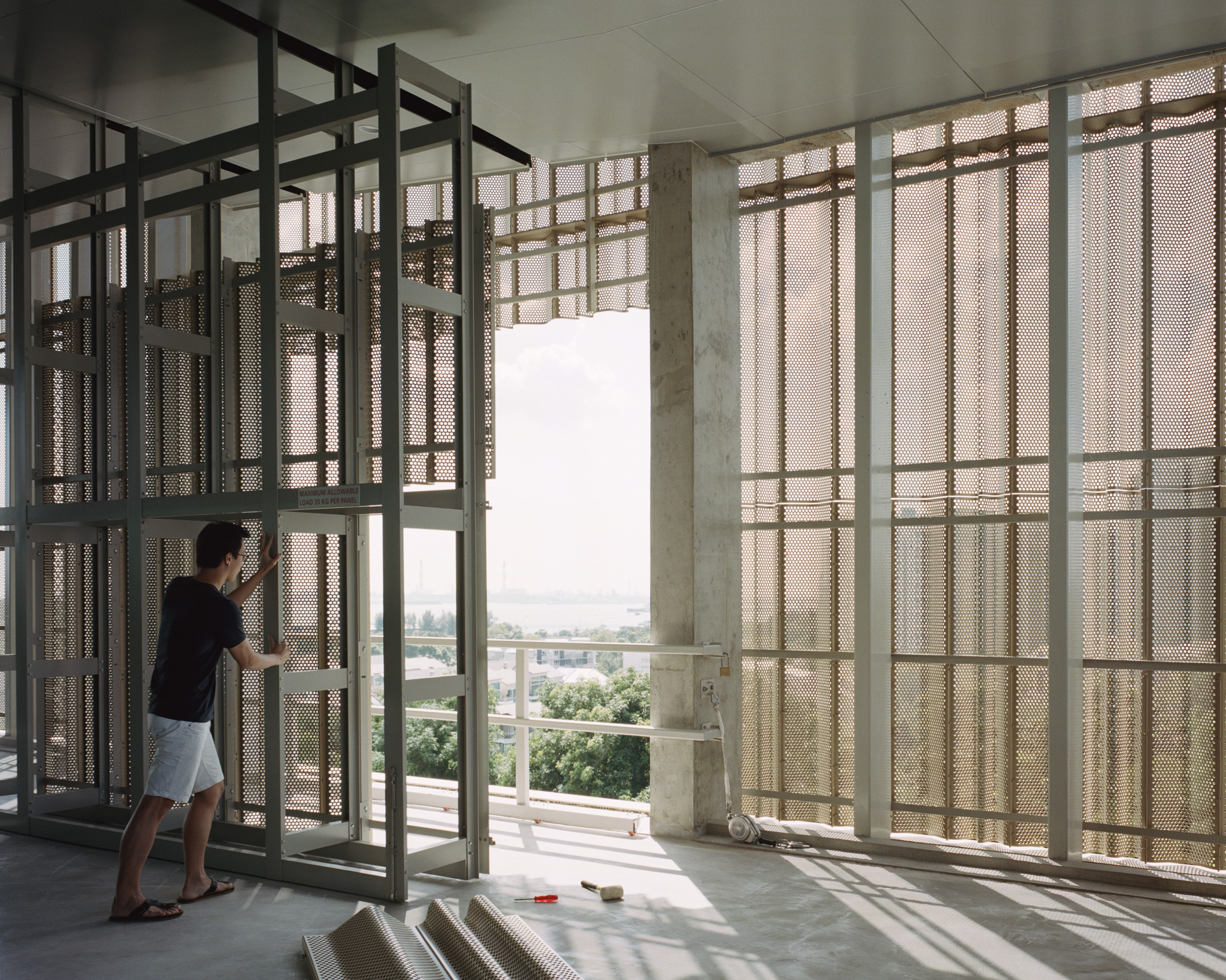 Examples of such systems can be found in SDE4, such as a façade that is visually porous to allow light through while enhancing visibility of the outside. It also facilitates wind passing through to keep the internal spaces naturally ventilated and cool, while reasonably keeping the rain out.