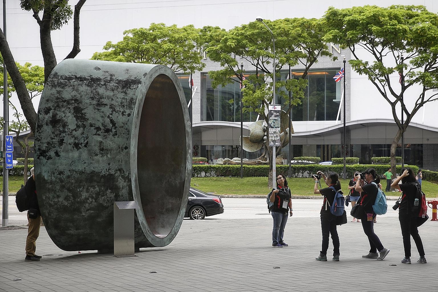 Participants snapping pictures of the bronze ring sculpture Abundance III, by Singapore-based sculptor Sun Yu-li, during the 14th edition of the Canon PhotoMarathon 2016 at Suntec Singapore on Saturday.