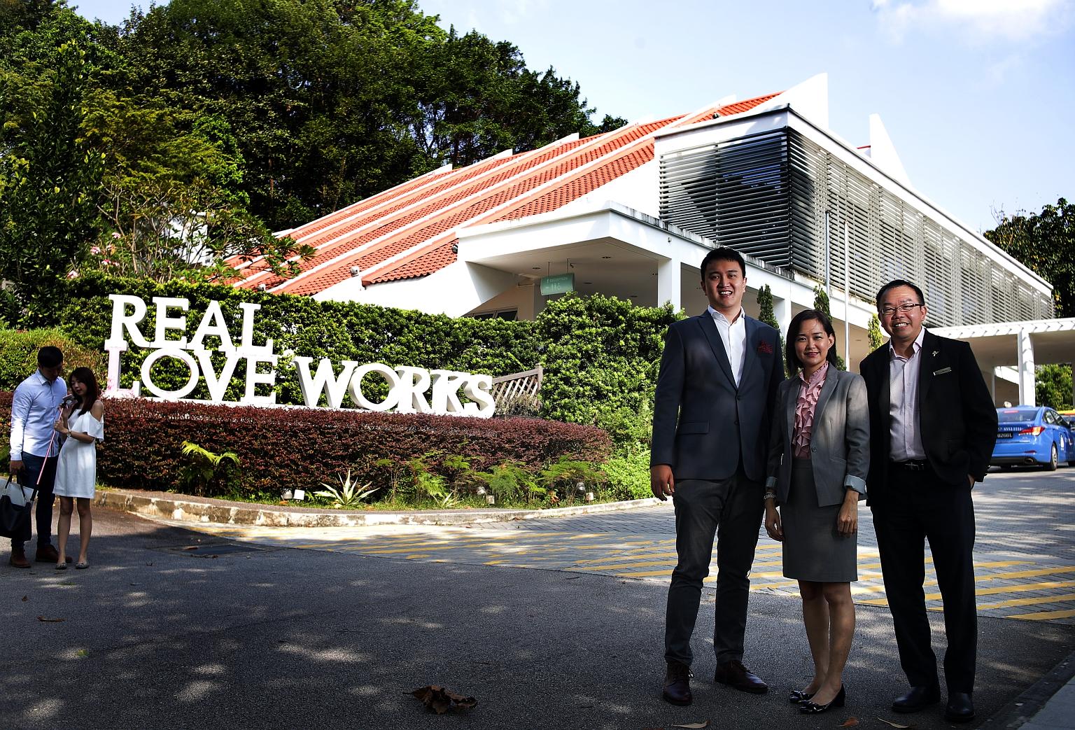 Wedding solemnisers (from left) Jonathan Huang, Serene Goh and Alex Ang in front of the "Real Love Works" sculpture outside the ROM building in Canning Rise. Originally the name of a National Family Council campaign, the words have since become synonymous with the registry.