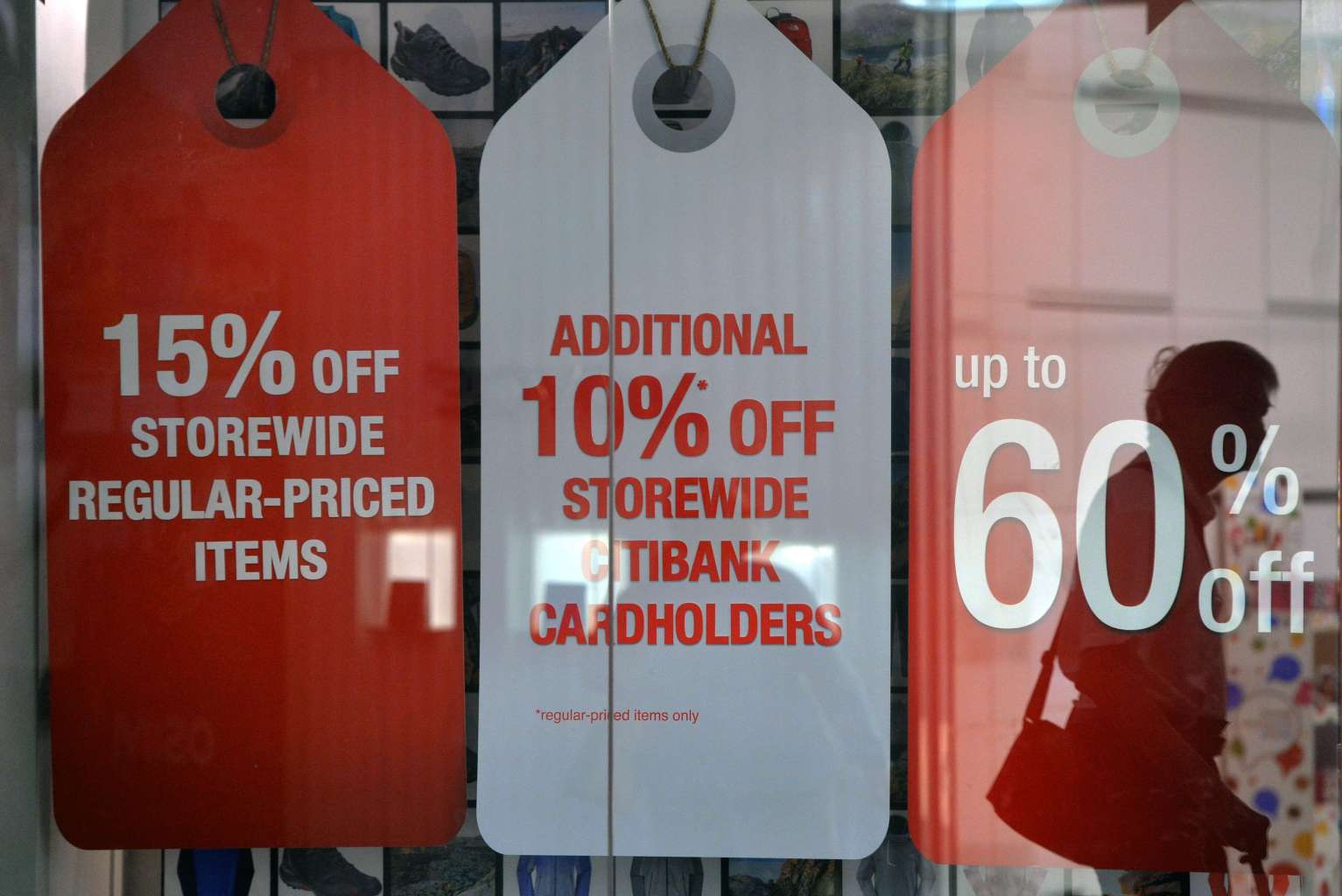 Discount posters hanging at a store participating in the Great Singapore Sale 2016.