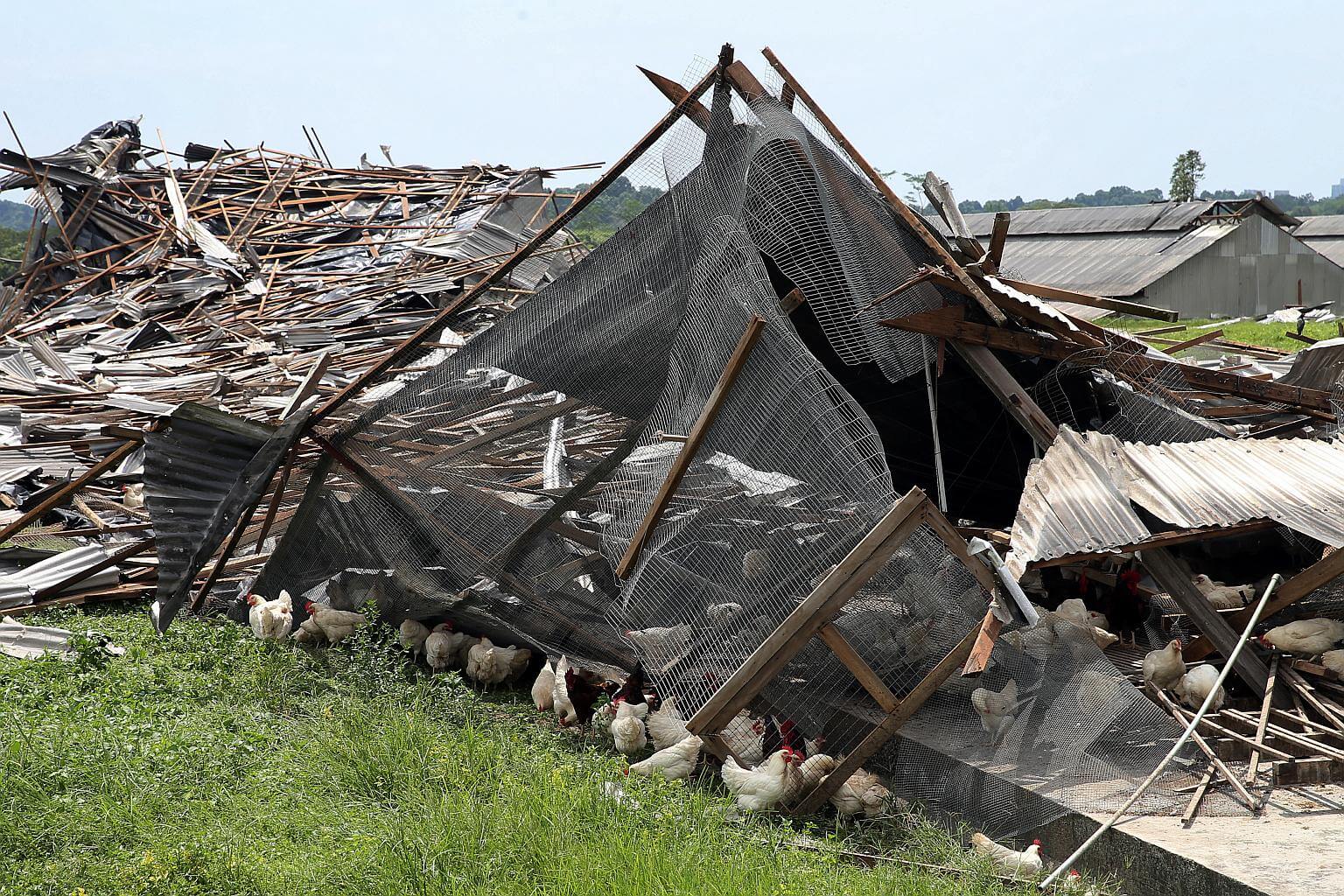The force of the winds on Friday caused some zinc panels to cut into tree branches. Several chicken barns at egg farm Chew's Agriculture were flattened.