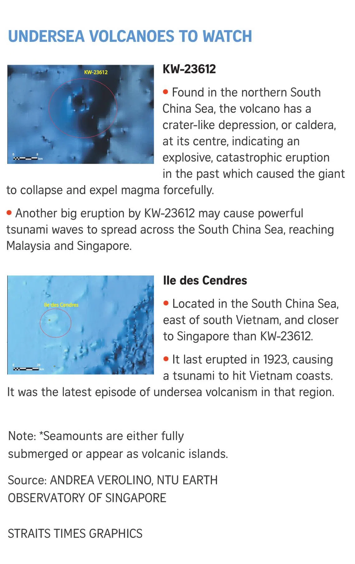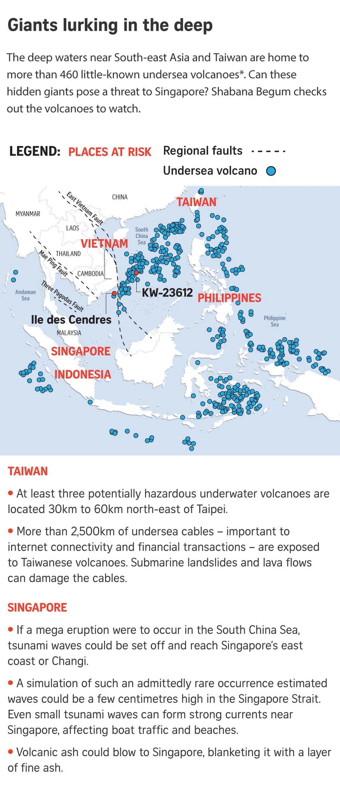 SINGAPORE – It has long been assumed that Singapore is sheltered from volcanic eruptions and tsunamis, but new research into 466 lesser-known undersea volcanoes in the region shows that the island state is not immune to rare, explosive events.