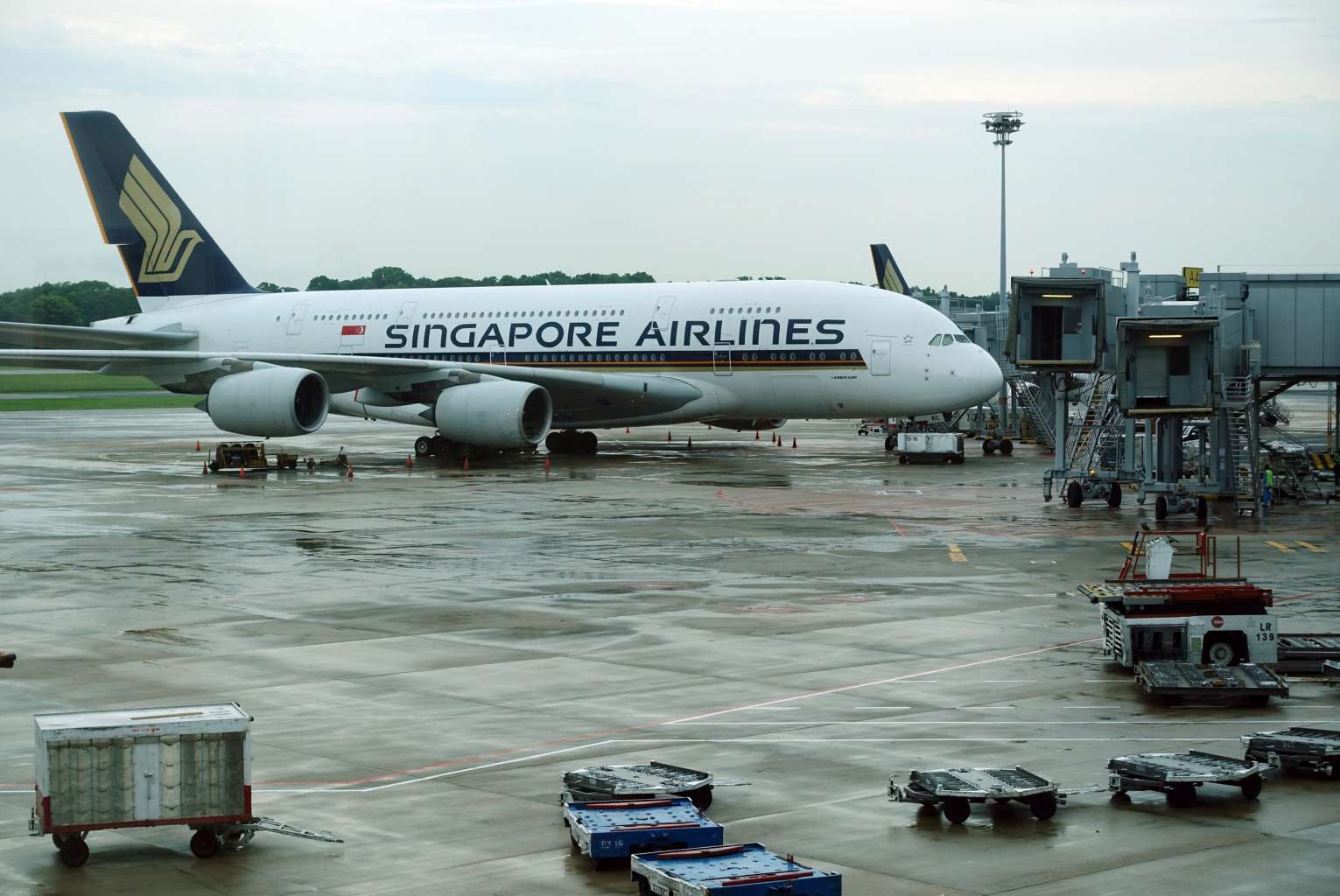 A Singapore Airlines plane parked on the tarmac at Changi Airport Terminal 3.