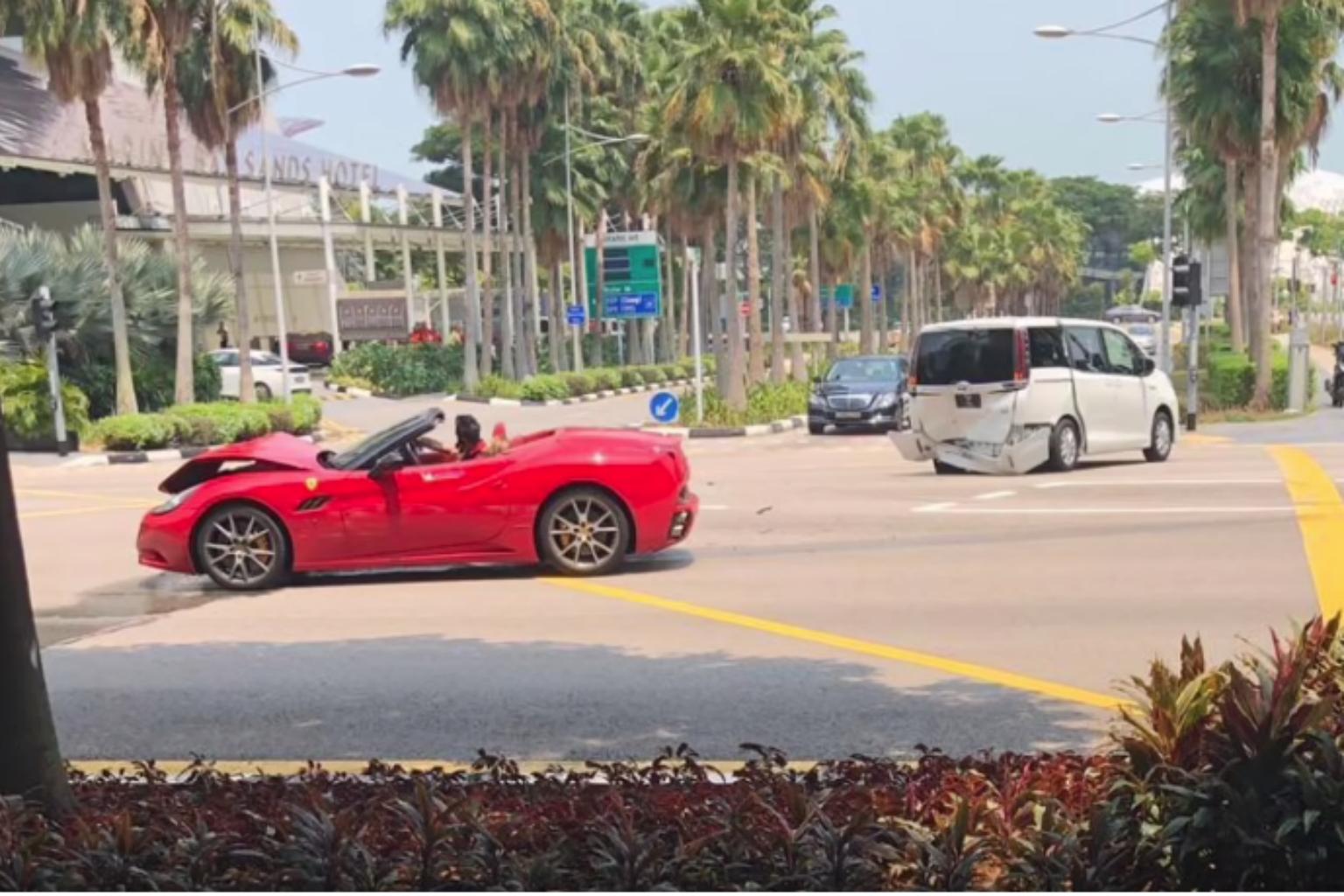 SINGAPORE - A 29-year-old woman was taken to hospital on Thursday (Sept 26) after her car met with an accident involving two other cars, including a red Ferrari that had its front badly damaged after the collision.