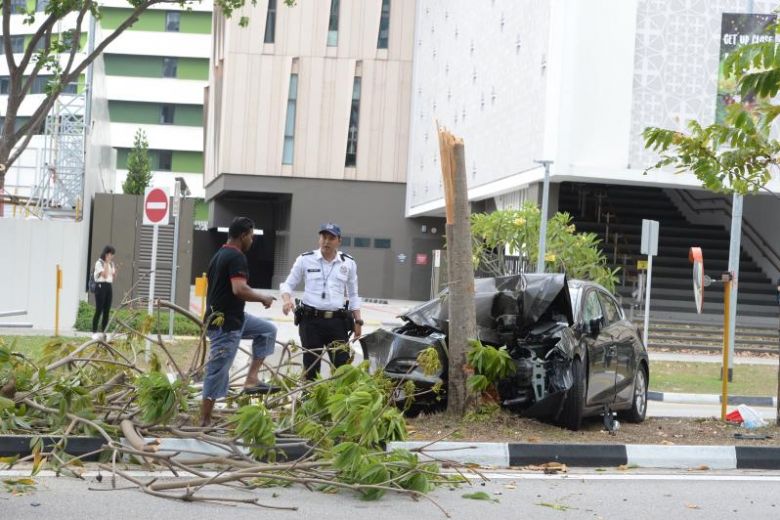 The car breached the kerb and hit the tree at high speed before swerving 90 degrees and hitting three people waiting to cross the road in Punggol Central on Feb 3, 2019.